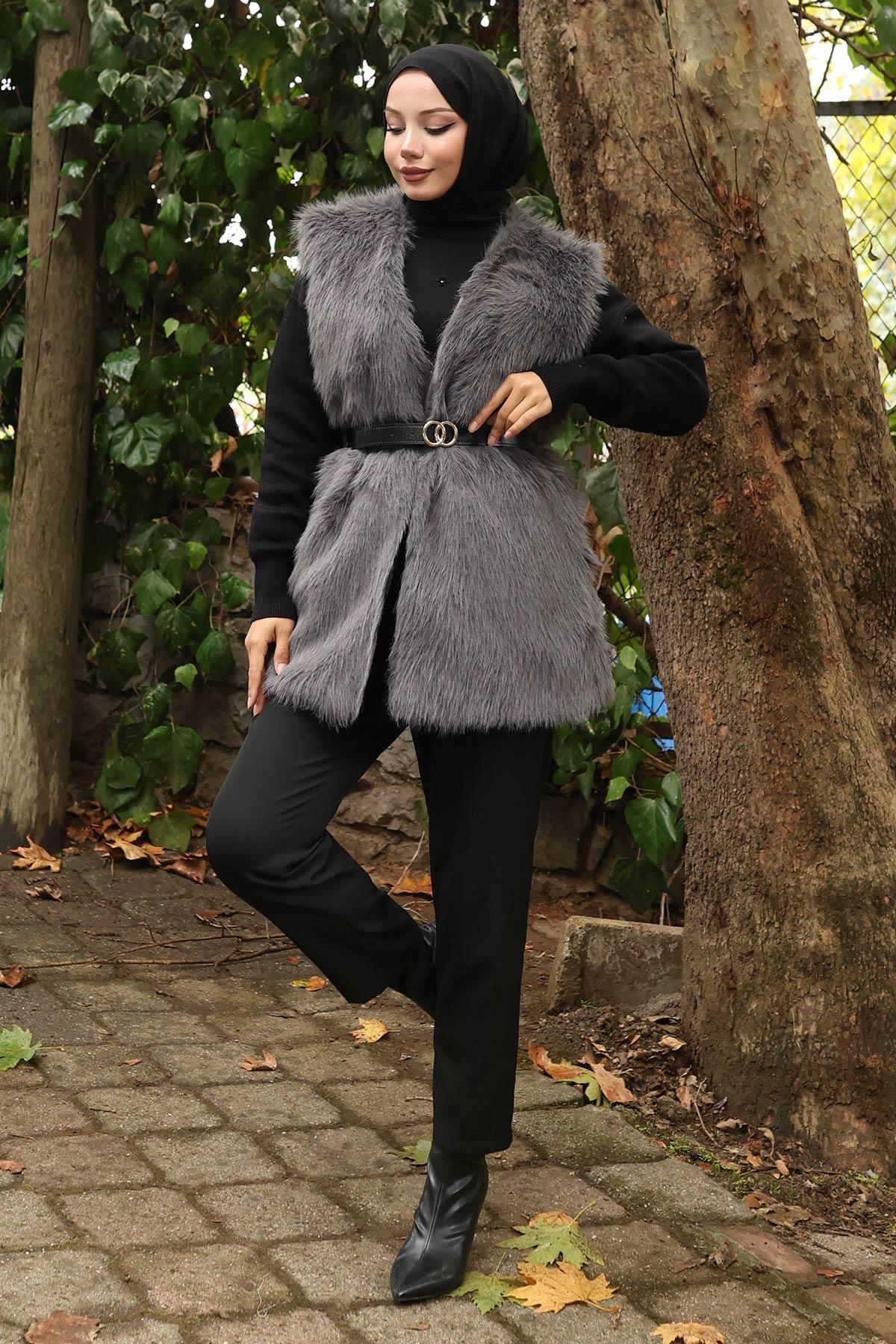 Kemerli Kürklü Yelek Gri 19372 (19372-4-38)
