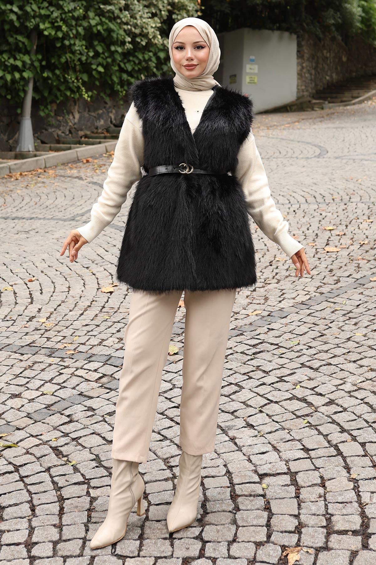 Kemerli Kürklü Yelek Siyah 19372