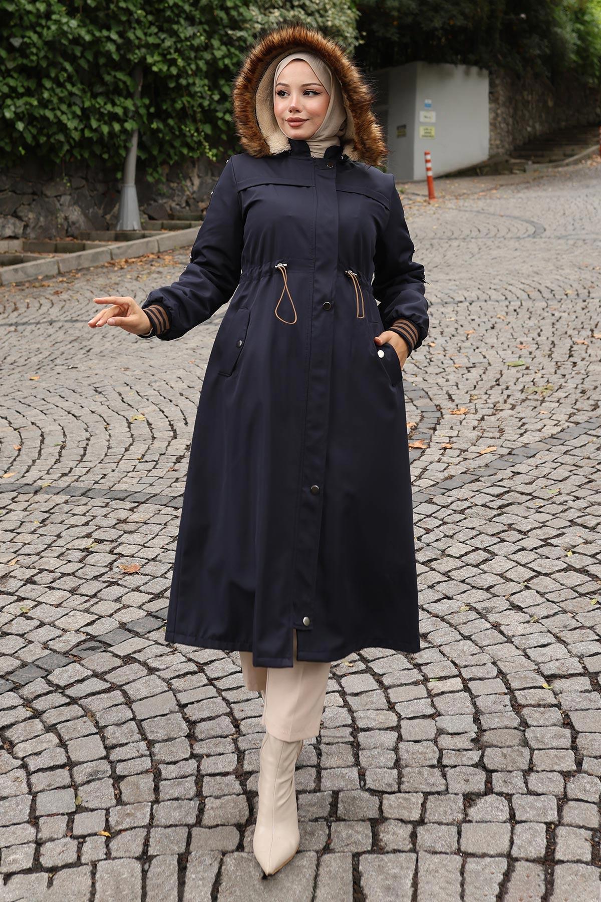 Kürk Yakalı Beli Bağcıklı Mont Lacivert 19269 (19269-2-38)