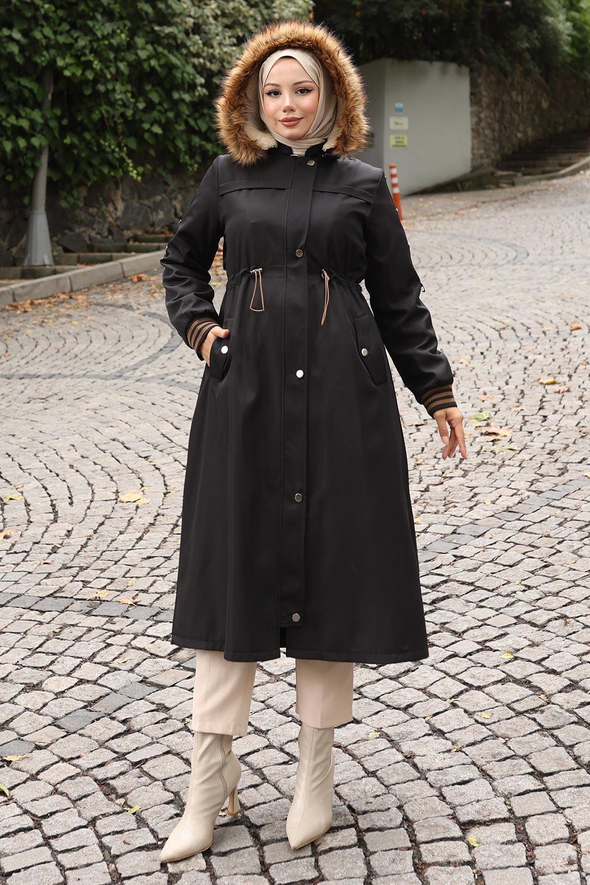 Kürk Yakalı Beli Bağcıklı Mont Siyah 19269 (19269-1-38)
